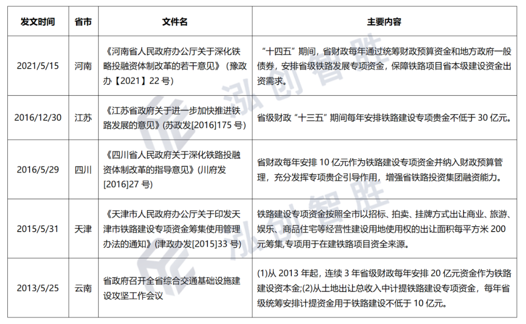 (4)地方鐵路發(fā)展基金,很多地方成立了省級的地方鐵路發(fā)展基金,在省級層面通過吸引財務(wù)投資人等手段籌措鐵路項目資本金。