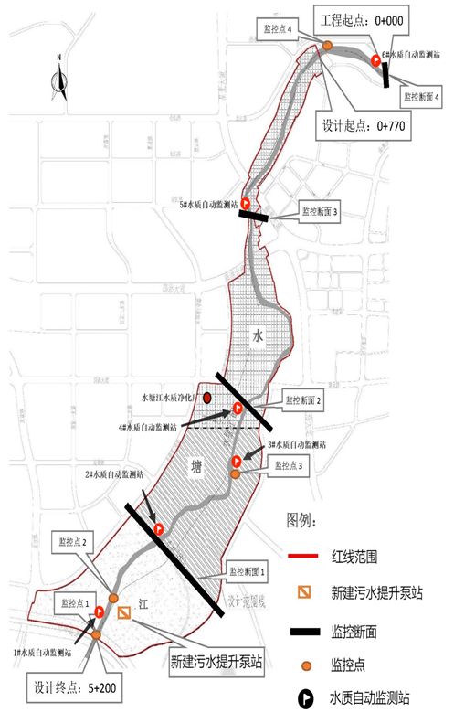 2.項目主要建設(shè)規(guī)模為:河道整治總長約8590m,河道寬約 30~300m,其中主河道長6142m,支流1河道長974m,支流2河道長1475m;擬建污水水質(zhì)凈化廠尾水凈化濕地3處;新建設(shè)計規(guī)模為2萬m3/天的補水泵站1座;新建污水處理廠1座,建設(shè)規(guī)模為近期5萬m3/天(遠(yuǎn)期10萬m3/天);建設(shè)3座入河監(jiān)測站、3座水質(zhì)監(jiān)測站、1座氣象自動監(jiān)測站等信息監(jiān)控系統(tǒng)平臺。