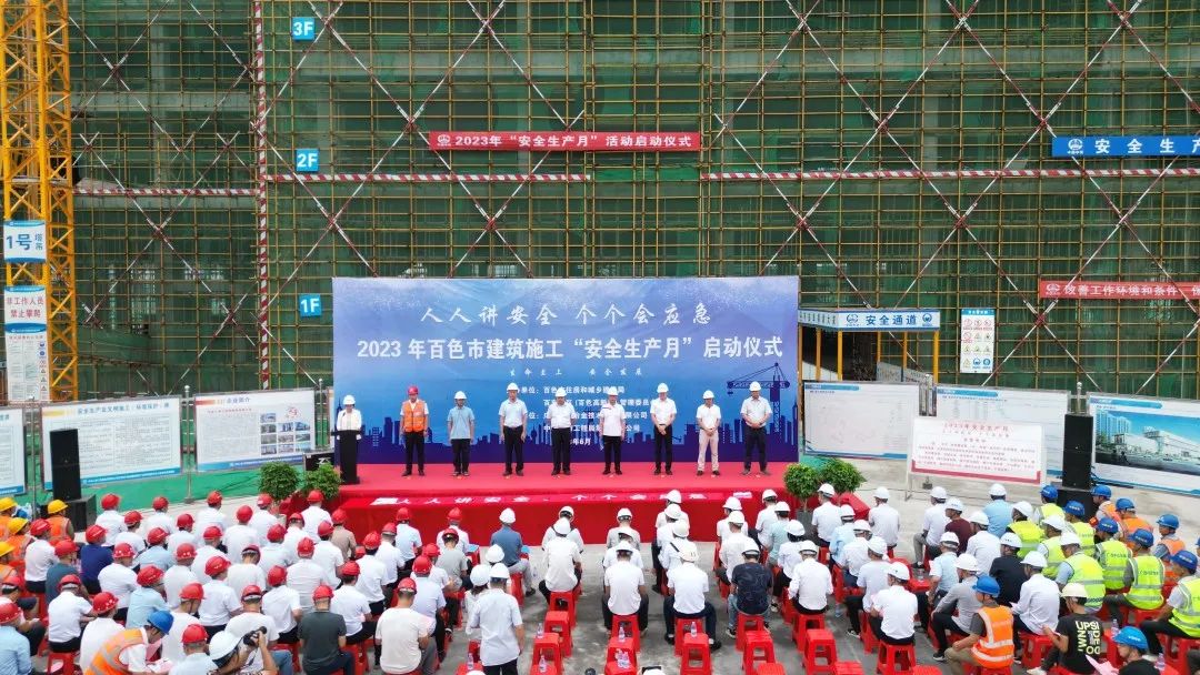 百色市住房和城鄉(xiāng)建設局組織了駐百色城區(qū)全體在建項目施工單位項目經(jīng)理、監(jiān)理單位總監(jiān)和百色市住房和城鄉(xiāng)建設局黨組成員、副局長潘龍出席啟動儀式并宣布2023年百色市“安全生產(chǎn)月”活動正式啟動。百東新區(qū)(百色高新區(qū))黨工委委員、管委會副主任黃少鷹致詞、吉利百礦集團公司安全環(huán)保部部長張渡軍作動員講話。一線工人代表120余人參加。