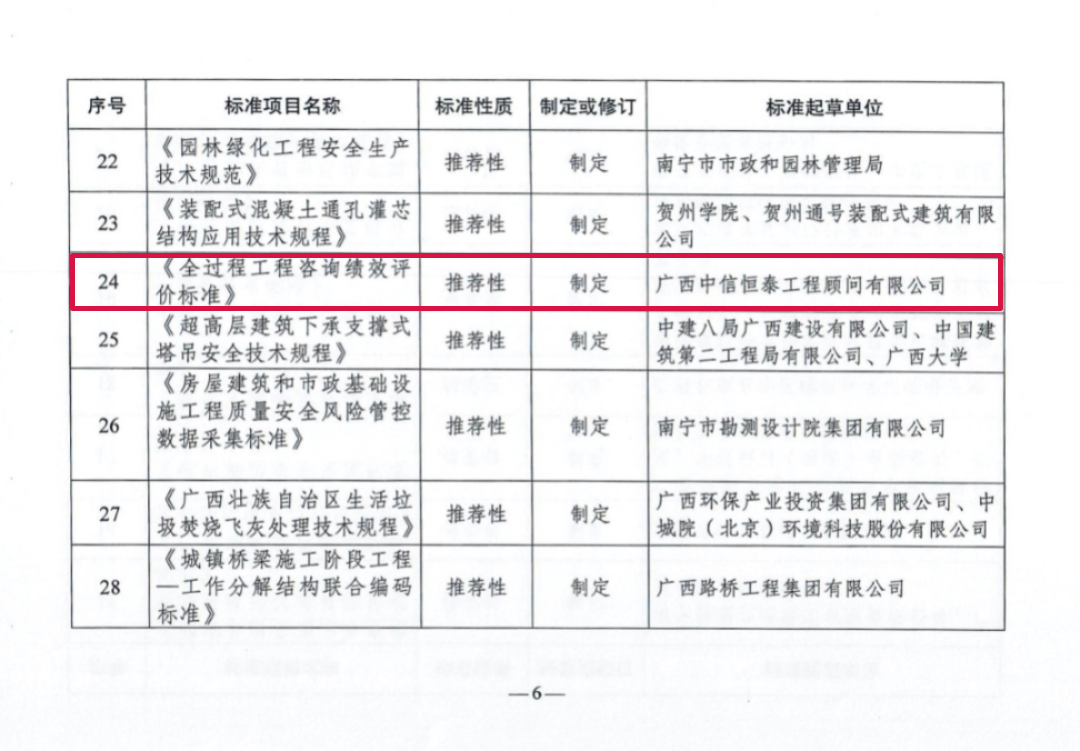 近日,廣西壯族自治區(qū)住房城鄉(xiāng)建設(shè)廳發(fā)布了《自治區(qū)住房城鄉(xiāng)建設(shè)廳關(guān)于下達(dá)2023年度全區(qū)工程建設(shè)地方標(biāo)準(zhǔn)制(修)訂項(xiàng)目計(jì)劃的通知》(桂建標(biāo)〔2023〕15號(hào)),由中信恒泰主編的《全過(guò)程工程咨詢績(jī)效評(píng)價(jià)標(biāo)準(zhǔn)》獲批立項(xiàng)。