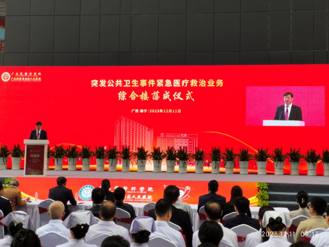 2023年12月11日上午,自治區(qū)人民醫(yī)院邕武醫(yī)院突發(fā)公共衛(wèi)生事件緊急醫(yī)療救治業(yè)務(wù)綜合樓項目落成儀式隆重舉行。自治區(qū)衛(wèi)生健康委二級巡視員吳才林,自治區(qū)住建廳二級調(diào)研員孫忠明,廣西醫(yī)學(xué)科學(xué)院·廣西壯族自治區(qū)人民醫(yī)院各兄弟、友好單位,廣西醫(yī)學(xué)科學(xué)院·廣西壯族自治區(qū)人民醫(yī)院黨委書記楊建榮攜領(lǐng)導(dǎo)班子,以及各參建單位代表共同出席本次落成儀式,廣西中信恒泰工程顧問有限公司總經(jīng)理周仰東應(yīng)邀出席。