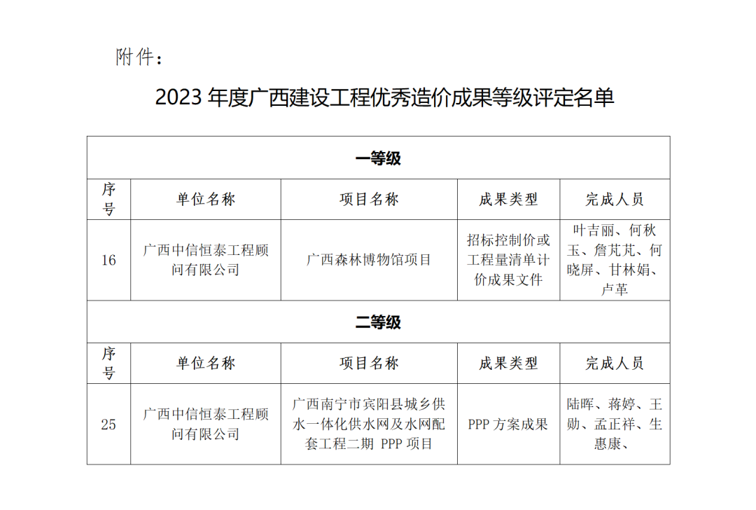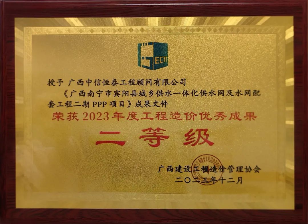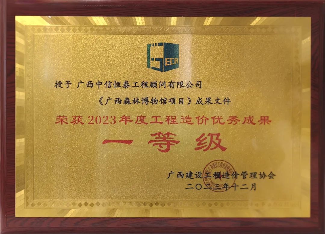 近日,廣西建設(shè)工程造價(jià)管理協(xié)會(huì)第五屆第五次理事會(huì)暨第三次會(huì)員代表大會(huì)在南寧順利召開,會(huì)上頒發(fā)了2023年度優(yōu)秀工程造價(jià)成果等級(jí)評(píng)定證書,中信恒泰編制的《廣西森林博物館項(xiàng)目》成果文件和《廣西南寧市賓陽(yáng)縣城鄉(xiāng)供水一體化供水網(wǎng)及水網(wǎng)配套工程二期PPP項(xiàng)目》成果文件分別榮獲2023年度工程造價(jià)優(yōu)秀成果一、二等級(jí)。