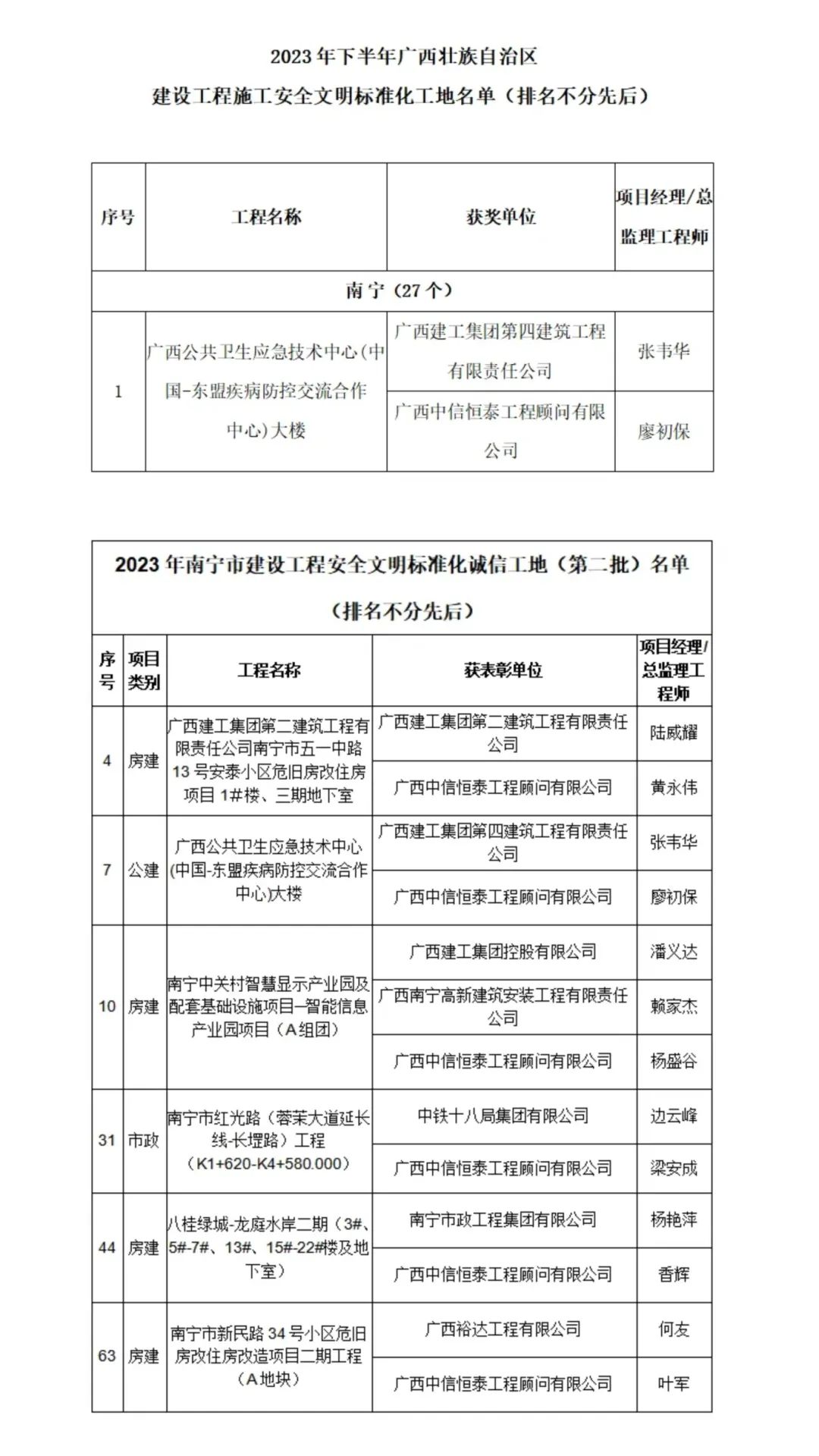 近日,廣西工程建設(shè)質(zhì)量安全管理協(xié)會、南寧市建設(shè)工程質(zhì)量安全協(xié)會分別公布了2023年下半年廣西壯族自治區(qū)建設(shè)工程施工安全文明標準化工地名單、2023年南寧市建設(shè)工程安全文明標準化誠信工地(第二批)名單。中信恒泰《廣西公共衛(wèi)生應(yīng)急技術(shù)中心(中國-東盟疾病防控交流合作中心)大樓》項目獲評2023年下半年廣西壯族自治區(qū)建設(shè)工程施工安全文明標準化工地,6個項目獲評2023年南寧市建設(shè)工程安全文明標準化誠信工地。