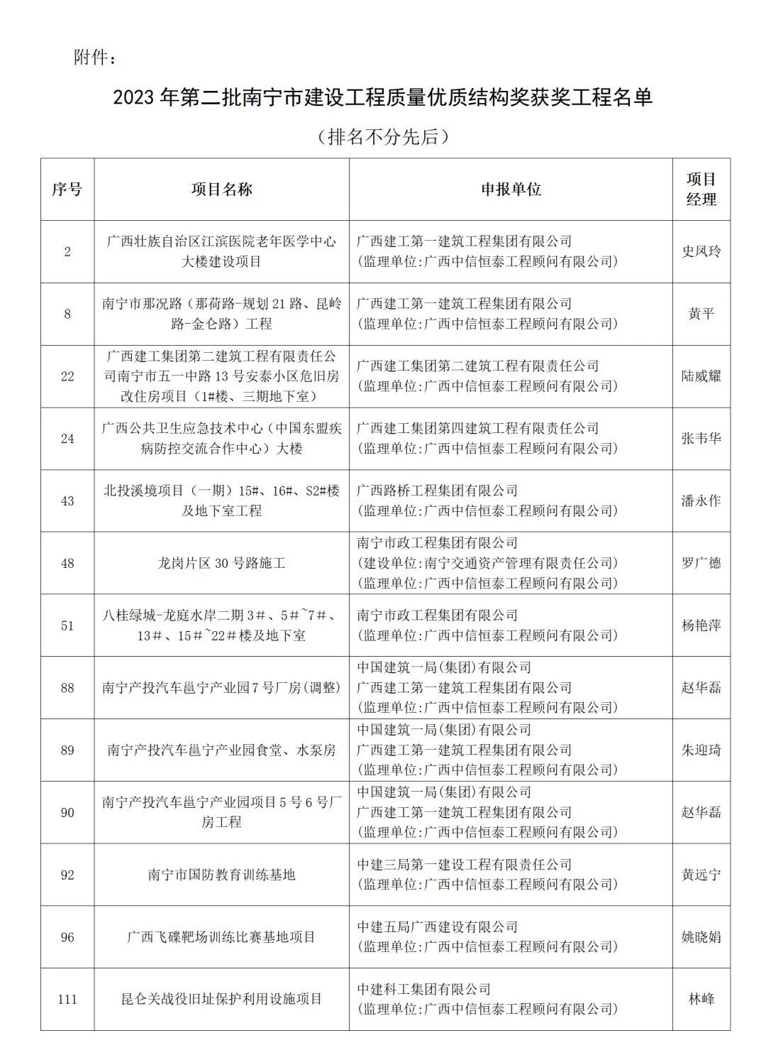 ◎中信恒泰13個項目榮獲2023年第二批南寧市建設(shè)工程質(zhì)量優(yōu)質(zhì)結(jié)構(gòu)獎