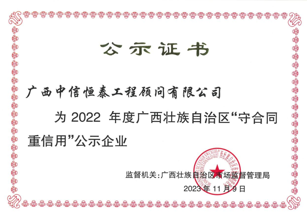 近日,廣西壯族自治區(qū)市場監(jiān)督管理局公布了《關(guān)于公示2022年度廣西“守合同重信用”企業(yè)名單的通告》。中信恒泰憑借良好的企業(yè)社會影響力、健全的合同信用管理體系、優(yōu)秀的合同履約狀況,再次榮獲廣西“守合同重信用”企業(yè)稱號。