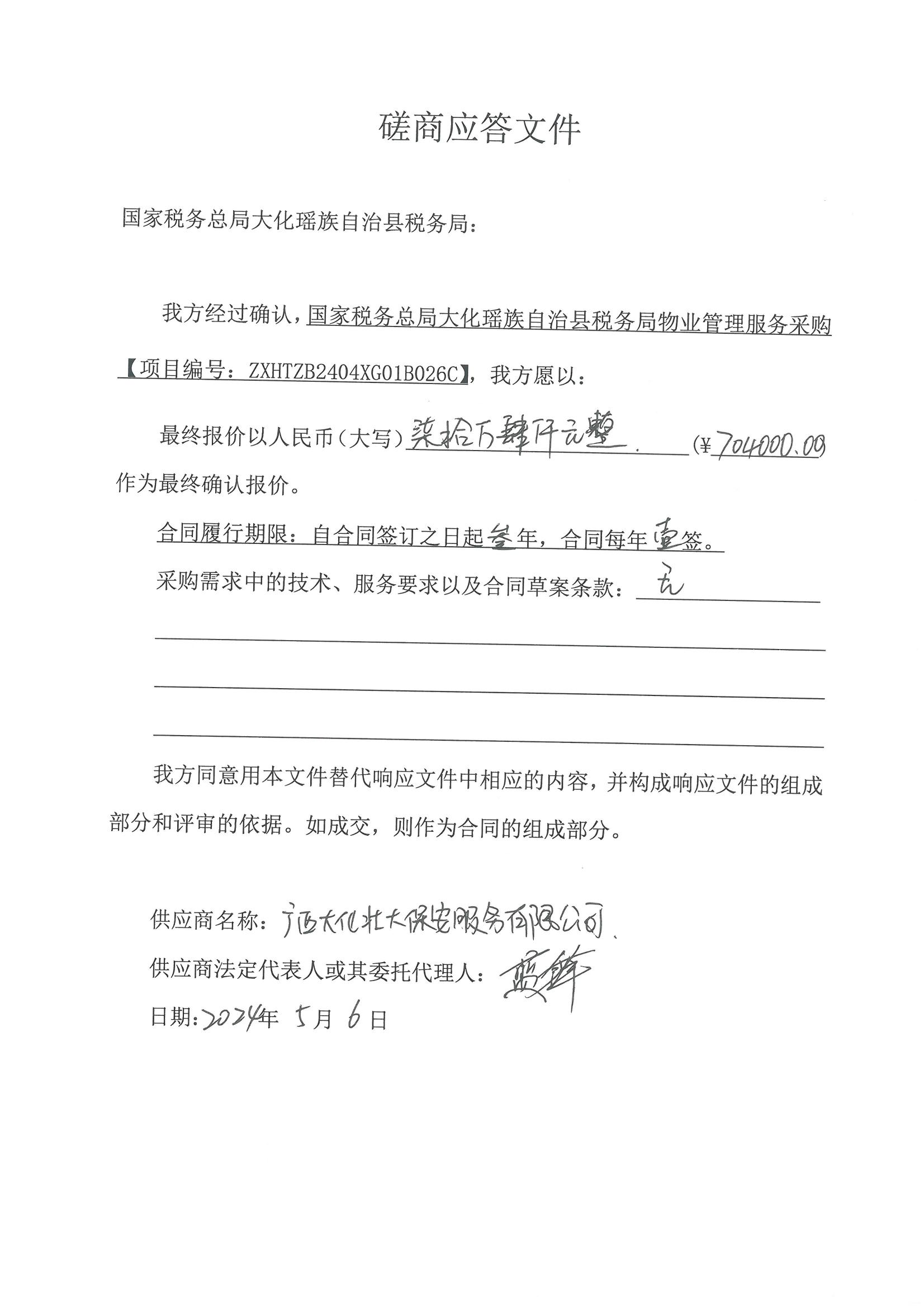 1 | 國家稅務總局大化瑤族自治縣稅務局物業(yè)管理服務采購 | 國家稅務總局大化瑤族自治縣稅務局物業(yè)管理服務,如需進一步了解詳細內容,詳見磋商文件。 | 詳細內容,詳見本項目競爭性磋商文件 | 自合同簽訂之日起3年,合同每年一簽 | 詳細內容,詳見本項目競爭性磋商文件 |