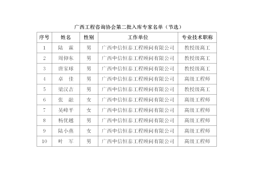 8月27日,廣西工程咨詢協(xié)會公布第二批入庫專家名單,廣西中信恒泰工程顧問有限公司董事長陸霖、總經(jīng)理周仰東,副總經(jīng)理唐家球、卓佳、梁漢吉等10位專家成功入庫。