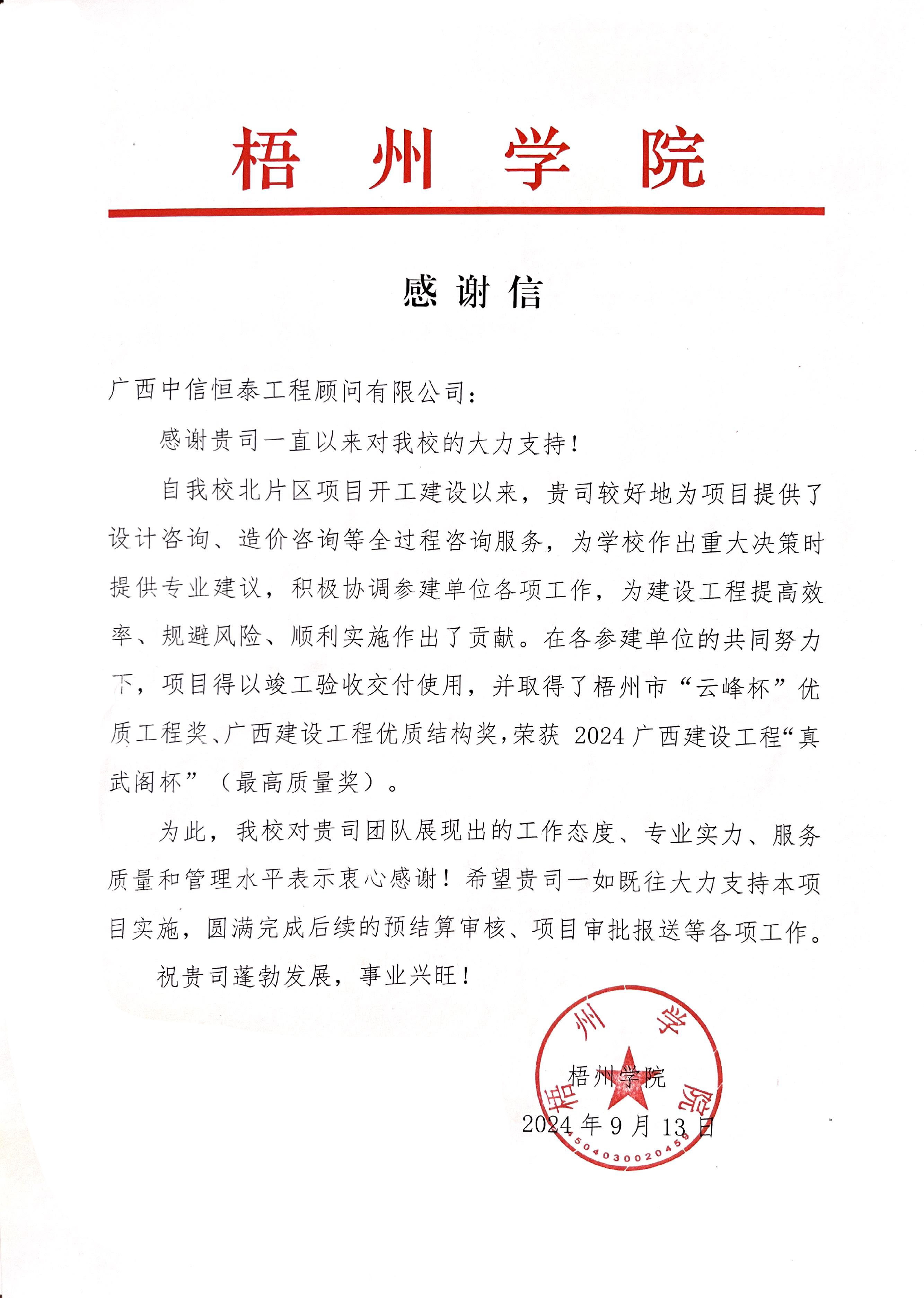 信中提到,自梧州學(xué)院北校區(qū)項目開工建設(shè)以來,中信恒泰憑借在全咨領(lǐng)域的專業(yè)優(yōu)勢,為項目提供了全面且深入的全過程咨詢服務(wù)。項目全咨團(tuán)隊不僅具備高度的專業(yè)素養(yǎng),還展現(xiàn)出了極強(qiáng)的責(zé)任心和敬業(yè)精神,積極協(xié)調(diào)各參建單位,確保項目順利推進(jìn)。在各參建單位的共同努力下,項目取得了梧州市“云峰杯”優(yōu)質(zhì)工程獎、廣西建設(shè)工程優(yōu)質(zhì)結(jié)構(gòu)獎、2024廣西建設(shè)工程“真武閣獎”(最高質(zhì)量獎)等榮譽(yù)。對此,梧州學(xué)院對中信恒泰項目全咨團(tuán)隊展現(xiàn)出的工作態(tài)度、專業(yè)實力、服務(wù)質(zhì)量和管理水平表示衷心的感謝。
