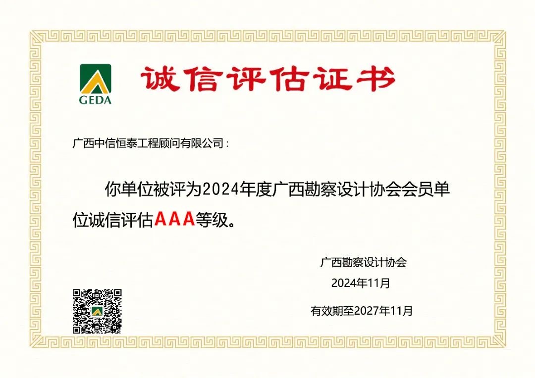近日,2024年廣西勘察設(shè)計協(xié)會會員單位誠信評估工作圓滿結(jié)束。經(jīng)過單位申報、專家評審、公示等一系列環(huán)節(jié),中信恒泰獲評廣西勘察設(shè)計協(xié)會AAA級誠信單位。