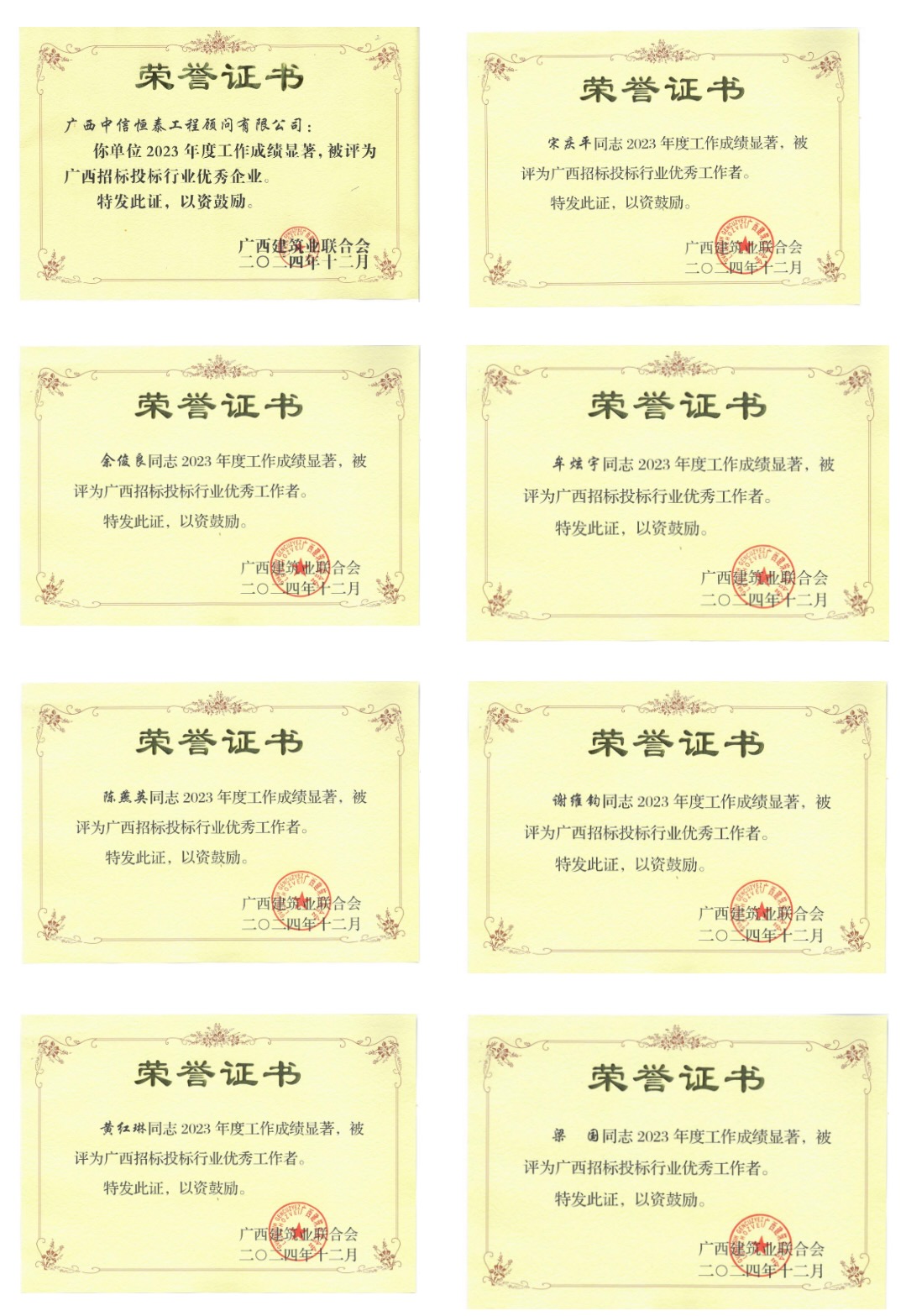 此外,廣西建筑業(yè)聯(lián)合會(huì)公布了《關(guān)于2023年度招標(biāo)投標(biāo)行業(yè)優(yōu)秀企業(yè)和優(yōu)秀工作者名單的通知》,中信恒泰榮獲2023年度“廣西招標(biāo)投標(biāo)行業(yè)優(yōu)秀企業(yè)”稱號(hào),公司八名員工獲評(píng)“廣西招標(biāo)投標(biāo)行業(yè)優(yōu)秀工作者”。這一系列榮譽(yù)的獲得,不僅是對(duì)中信恒泰在招標(biāo)投標(biāo)領(lǐng)域?qū)I(yè)能力的肯定,也彰顯了社會(huì)各界對(duì)公司長(zhǎng)期以來(lái)秉承“為客戶創(chuàng)造價(jià)值”經(jīng)營(yíng)理念的廣泛認(rèn)可。