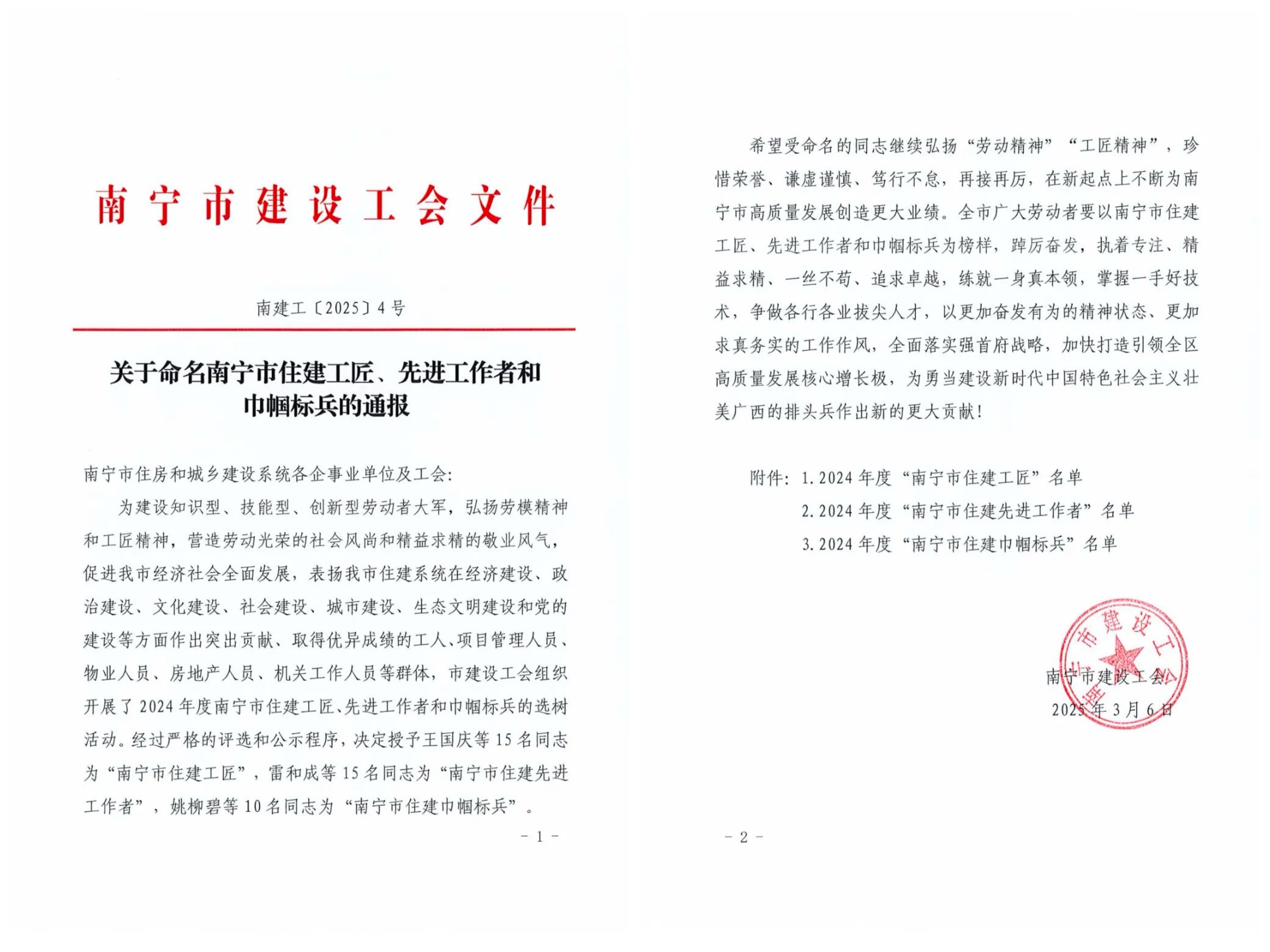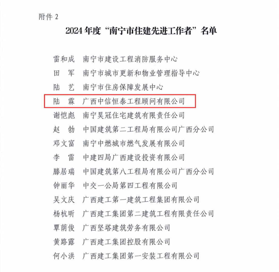 2025年3月6日,南寧市建設(shè)工會(huì)發(fā)布了《關(guān)于命名南寧市住建工匠、先進(jìn)工作者和巾幗標(biāo)兵的通報(bào)》。經(jīng)過嚴(yán)格評(píng)選和公示程序,廣西中信恒泰工程顧問有限公司董事長(zhǎng)陸霖獲評(píng)2024年度“南寧市住建先進(jìn)工作者”。