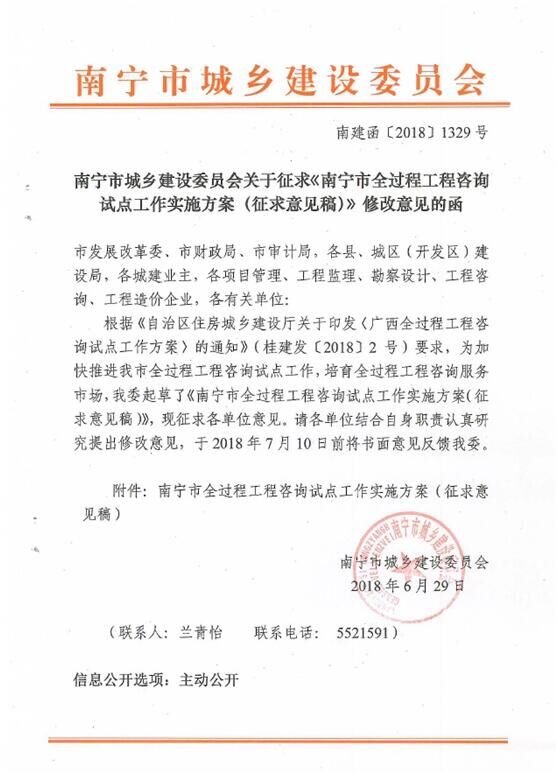 南寧市城鄉(xiāng)建設(shè)委員會關(guān)于征求《南寧市全過程工程咨詢試點工作實施方案(征求意見稿)》修改意見的函(南建函?〔2018〕1329號)