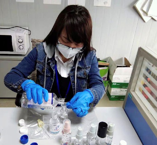 圖為資料組黃倩分發(fā)酒精,每天進行酒精消毒,保障一線工作人員的安全防護