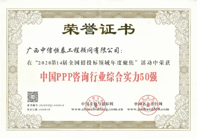 近日,由中國采購與招標網(wǎng)、中國名企排行網(wǎng)聯(lián)合主辦的“2020第14屆全國招投標領域年度聚焦”活動評選結果出爐。廣西中信恒泰工程顧問有限公司憑借過硬的專業(yè)實力和業(yè)界口碑,榮膺“中國PPP咨詢行業(yè)綜合實力50強”大獎。