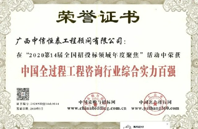 “中國(guó)全過(guò)程工程咨詢行業(yè)綜合實(shí)力百?gòu)?qiáng)”的榮譽(yù),即是對(duì)中信恒泰在全國(guó)全過(guò)程工程咨詢服務(wù)領(lǐng)域?qū)嵙Φ恼J(rèn)可,又是廣大業(yè)主對(duì)中信恒泰服務(wù)的支持和肯定。
