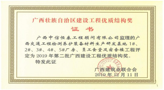 廣西交通產(chǎn)研基地自2018年7月份開工建設以來,中信恒泰監(jiān)理項目部狠抓安全、質(zhì)量、進度管理,強化質(zhì)量過程管控,積極打造精品工程。項目分別獲得了2019年廣西建設工程優(yōu)質(zhì)結(jié)構(gòu)獎、2019年南寧市建設工程安全文明標準化誠信工地、2018年度南寧市示范監(jiān)理項目部等榮譽。