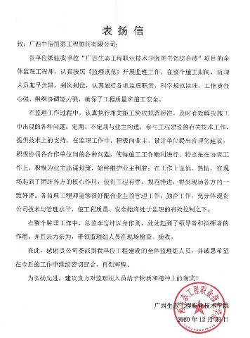 近日,中信恒泰收到一封來(lái)自業(yè)主方的表?yè)P(yáng)信,來(lái)信高度贊揚(yáng)了中信恒泰在擔(dān)任廣西生態(tài)工程職業(yè)技術(shù)學(xué)院圖書館綜合樓項(xiàng)目監(jiān)理過(guò)程中認(rèn)真負(fù)責(zé)的工作態(tài)度,體現(xiàn)了中信恒泰卓越的技術(shù)與管理水平。