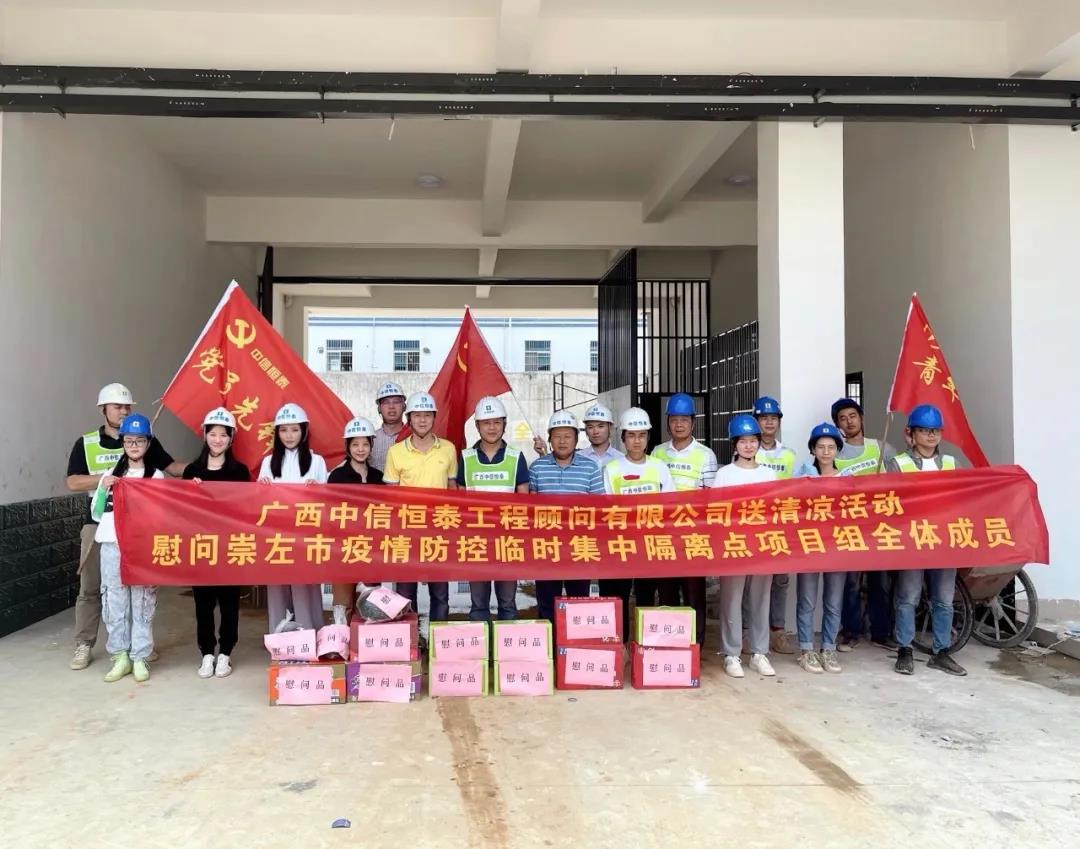 近日,中信恒泰集團董事長陸霖、總經(jīng)理周仰東、工會主席陸颯、副總經(jīng)理郭佳鑫及黨員代表赴崇左市疫情防控臨時集中隔離點項目為辛勤工作的一線員工送去飲料、水果等防暑用品,把集團的關(guān)懷傳遞到項目基層。