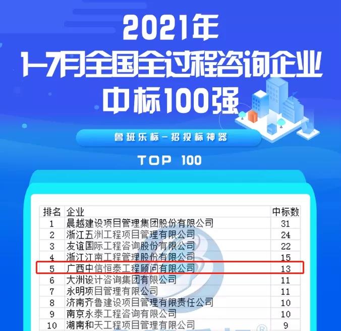 近日,魯班樂標(biāo)發(fā)布 “2021年1-7月全國全過程咨詢企業(yè)中標(biāo)100強(qiáng)”榜單,中信恒泰位列第五,穩(wěn)占全國全過程咨詢行業(yè)第一梯隊(duì),彰顯公司全過程工程咨詢綜合實(shí)力和競爭優(yōu)勢!