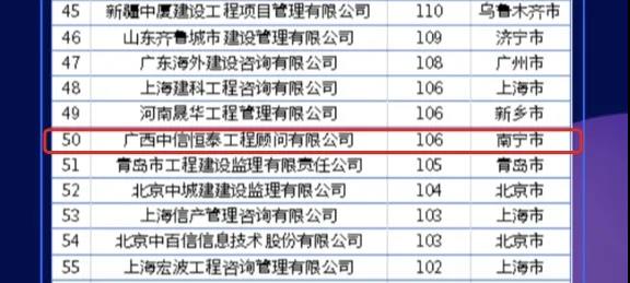 2021年初,中信恒泰入選魯班樂標(biāo)發(fā)布的“2020年全國建筑監(jiān)理企業(yè)中標(biāo)100強(qiáng)”,位居全國第50名,為廣西唯一上榜企業(yè)。