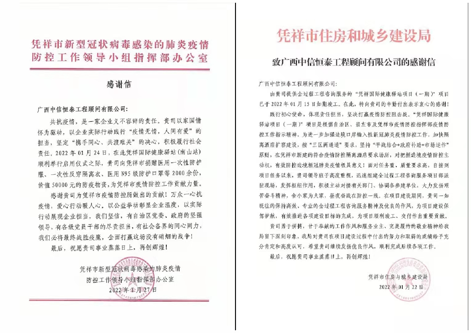 1月22日、1月27日,憑祥市住建局、憑祥市疫情防控指揮部辦公室分別給中信恒泰發(fā)來(lái)了感謝信。感謝信中,憑祥市住建局對(duì)中信恒泰全咨團(tuán)隊(duì)艱苦奮斗、晝夜奮戰(zhàn),高效、專(zhuān)業(yè)的服務(wù)精神表示高度贊賞,憑祥市疫情防控指揮部辦公室對(duì)中信恒泰向憑祥市捐贈(zèng)防疫物資的愛(ài)心行動(dòng)表示衷心感謝。