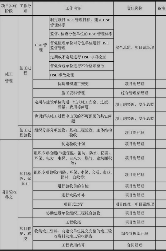 (a)施工階段主要工作為完成土石方工程、地基基礎(chǔ)工程、主體結(jié)構(gòu)工程、裝修工程、水電安裝工程、室外道路管網(wǎng)等市政工程、景觀綠化工程等工程項目的施工,進行施工過程質(zhì)量控制、進度控制、變更控制、施工費用控制、施工安全、標化工地管理,分項、階段驗收管理,按要求的工期全面完成施工任務。