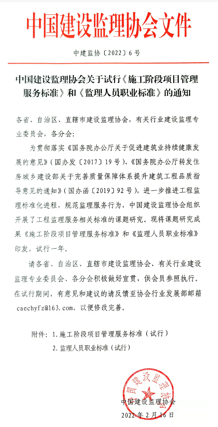 中國(guó)建設(shè)監(jiān)理協(xié)會(huì)關(guān)于試行《施工階段項(xiàng)目管理服務(wù)標(biāo)準(zhǔn)》和《監(jiān)理人員職業(yè)標(biāo)準(zhǔn)》的通知