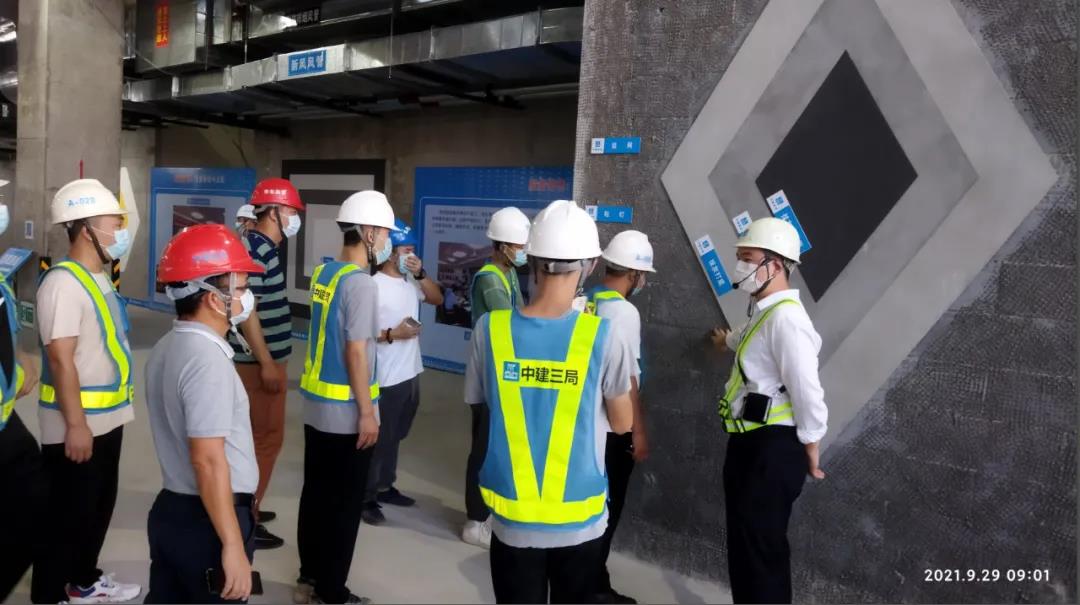 觀摩會(huì)現(xiàn)場,承辦單位向參觀人員現(xiàn)場展示了砌體抹灰施工工藝、石粉墻面施工工藝、墻面涂料施工工藝、機(jī)電設(shè)備施工工藝、外架金屬鋼板網(wǎng)施工工藝、陶粒板輕質(zhì)隔墻施工工藝、外墻ALC施工工藝等13種工藝實(shí)體樣板,詳細(xì)介紹了各工藝的質(zhì)量管控重點(diǎn)。其中外架金屬鋼板網(wǎng)施工工藝、陶粒板輕質(zhì)隔墻施工工藝、外墻ALC施工工藝為本工程的工藝亮點(diǎn)。觀摩會(huì)上還設(shè)置了VR質(zhì)量安全體驗(yàn)區(qū)、BIM技術(shù)應(yīng)用、安全教育小黑屋、安全教育培訓(xùn)室等,更好的展現(xiàn)項(xiàng)目如何運(yùn)用現(xiàn)代化技術(shù)管控現(xiàn)場。參觀人員不時(shí)與項(xiàng)目管理人員就質(zhì)量控制、安全管理等各方面細(xì)進(jìn)行探討交流。觀摩會(huì)現(xiàn)場內(nèi)容豐富,亮點(diǎn)突出,得到了參觀人員一致好評。