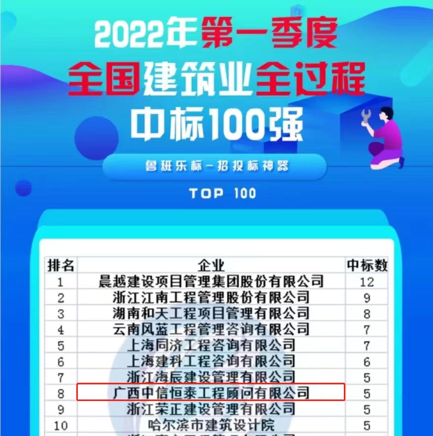 此前,在魯班樂標(biāo)發(fā)布的多個全咨中標(biāo)百強(qiáng)榜榜單,中信恒泰均位列全國前列,在廣西區(qū)同行企業(yè)中穩(wěn)居榜首。