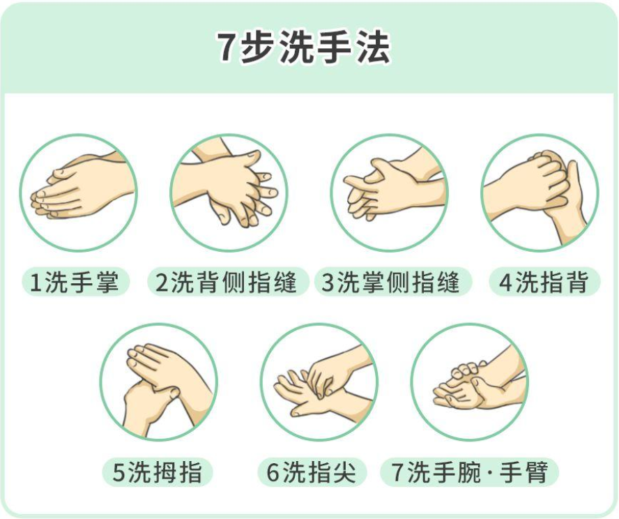 建議采用七步洗手法(如上圖)。以下情況應(yīng)及時洗手:外出回來后、咳嗽或打噴嚏后、接觸可能被污染過的物體表面(選購生鮮產(chǎn)品、收快遞)后、用餐前、上廁所后、接觸過動物后等。
