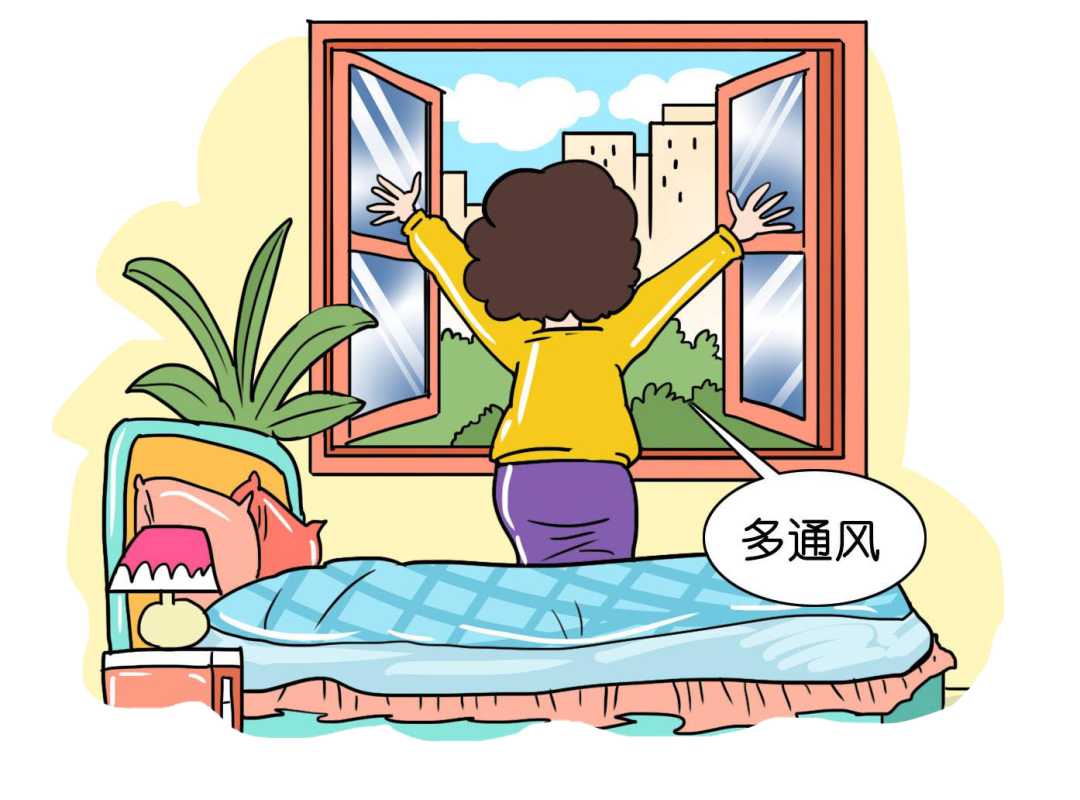 每天早、中、晚均應(yīng)開窗通風(fēng),每次通風(fēng)的時間不短于15分鐘。寒冷季節(jié)開窗通風(fēng)要注意保暖,避免受涼。