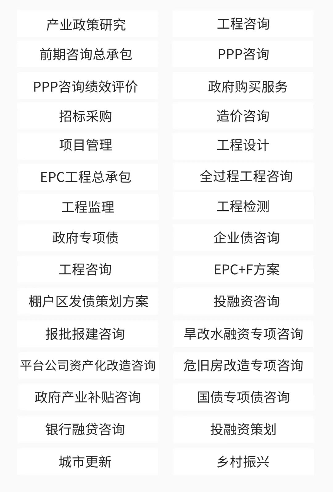 ◆ 完整的建筑業(yè)產(chǎn)業(yè)鏈包括項(xiàng)目全生命周期內(nèi)的投資機(jī)會(huì)分析、策劃咨詢、工程咨詢(前期咨詢總承包)、產(chǎn)業(yè)政策研究、投融資咨詢(政府產(chǎn)業(yè)補(bǔ)貼咨詢、國(guó)債專項(xiàng)債咨詢和銀行融貸咨詢)、平臺(tái)資產(chǎn)化改造和信用評(píng)價(jià)提升、全過(guò)程工程咨詢、PPP咨詢、PPP績(jī)效評(píng)價(jià)、工程設(shè)計(jì)、招標(biāo)代理、造價(jià)咨詢、工程監(jiān)理、工程檢測(cè)、政府購(gòu)買服務(wù)、EPC工程總承包、BIM技術(shù)咨詢、無(wú)人機(jī)技術(shù)及運(yùn)營(yíng)維護(hù)等各項(xiàng)業(yè)務(wù)。