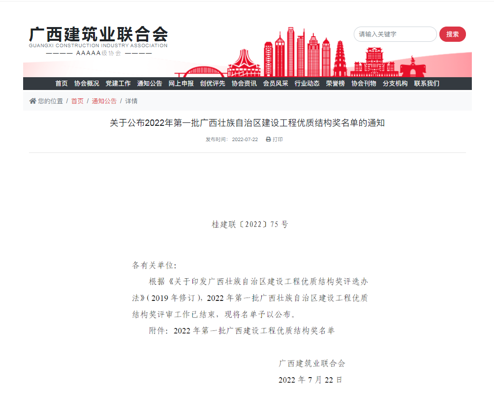 廣西建設(shè)工程優(yōu)質(zhì)結(jié)構(gòu)獎由廣西建筑業(yè)聯(lián)合會組織評審、頒發(fā),是廣西建設(shè)工程主體結(jié)構(gòu)施工質(zhì)量的最高榮譽獎。工程質(zhì)量需達到同時期廣西區(qū)內(nèi)領(lǐng)先水平,要求符合法律法規(guī)與標準規(guī)定、施工管理規(guī)范、過程控制嚴格有效并積極應(yīng)用建筑業(yè)新技術(shù)。