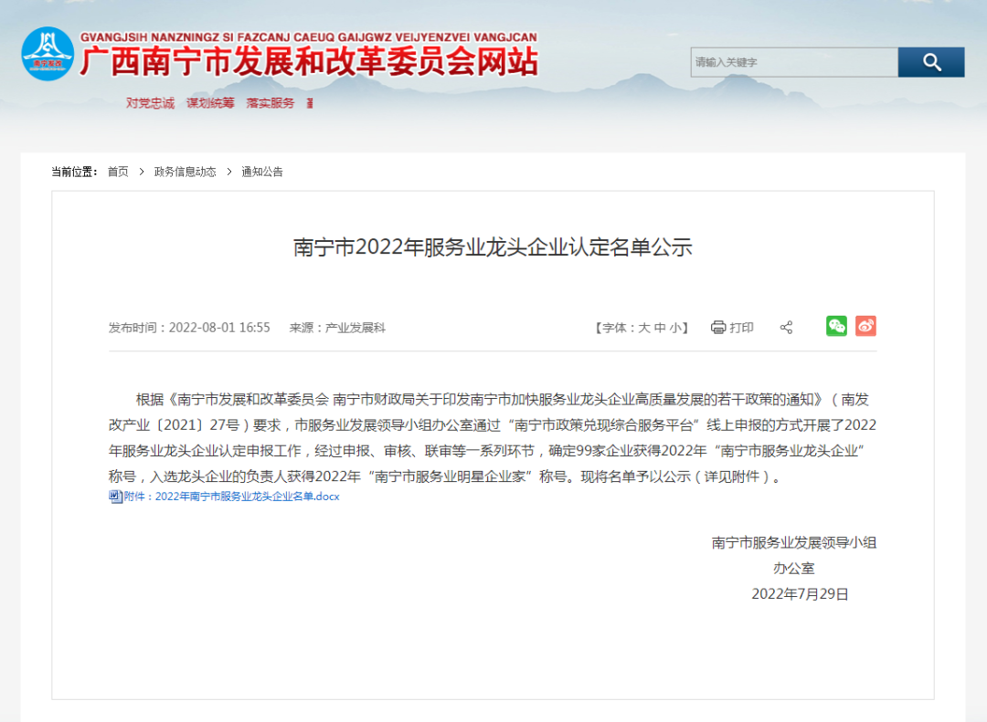 喜訊 | 中信恒泰獲2022年“南寧市服務(wù)業(yè)龍頭企業(yè)”稱號(hào)