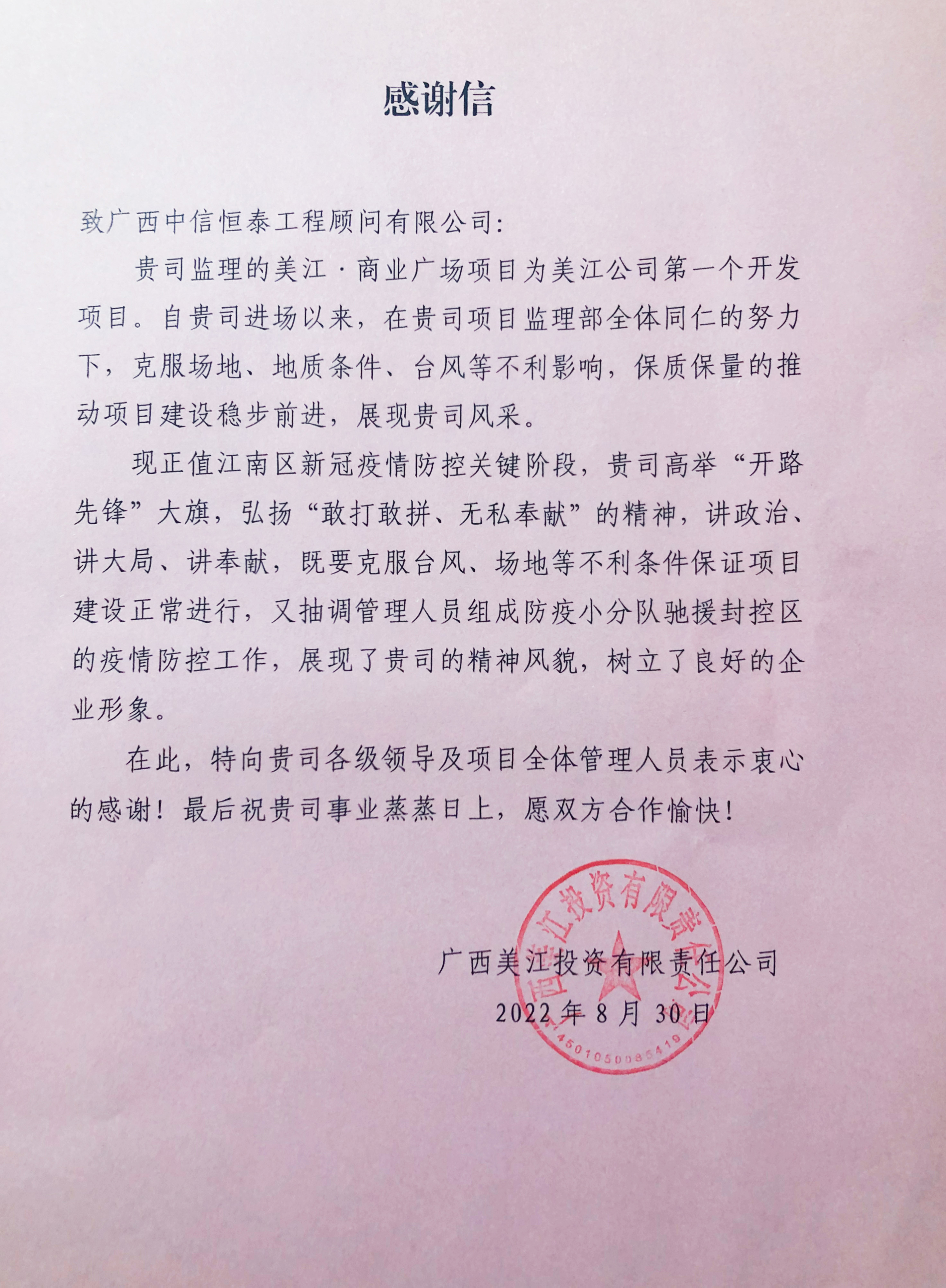 信中提到,在美江·商業(yè)廣場(chǎng)項(xiàng)目在工程開工建設(shè)過(guò)程中,面對(duì)施工現(xiàn)場(chǎng)場(chǎng)地受限、地質(zhì)條件、臺(tái)風(fēng)等不利因素影響,中信恒泰項(xiàng)目監(jiān)理部全體員工團(tuán)結(jié)一致、夜以繼日、堅(jiān)守崗位,始終保持嚴(yán)謹(jǐn)細(xì)致的工作態(tài)度,以專業(yè)高效的服務(wù)水準(zhǔn)為項(xiàng)目提供監(jiān)理服務(wù),保質(zhì)保量地推動(dòng)了項(xiàng)目建設(shè)穩(wěn)步前進(jìn)。此外,面對(duì)突如其來(lái)的疫情,中信恒泰項(xiàng)目監(jiān)理部弘揚(yáng)“敢打敢拼、無(wú)私奉獻(xiàn)”的精神,及時(shí)抽調(diào)人員加入防疫隊(duì)伍,馳援封控區(qū)的疫情防控工作。對(duì)此,廣西美江投資有限責(zé)任公司對(duì)中信恒泰的鼎力支持和幫助表示衷心的感謝。
