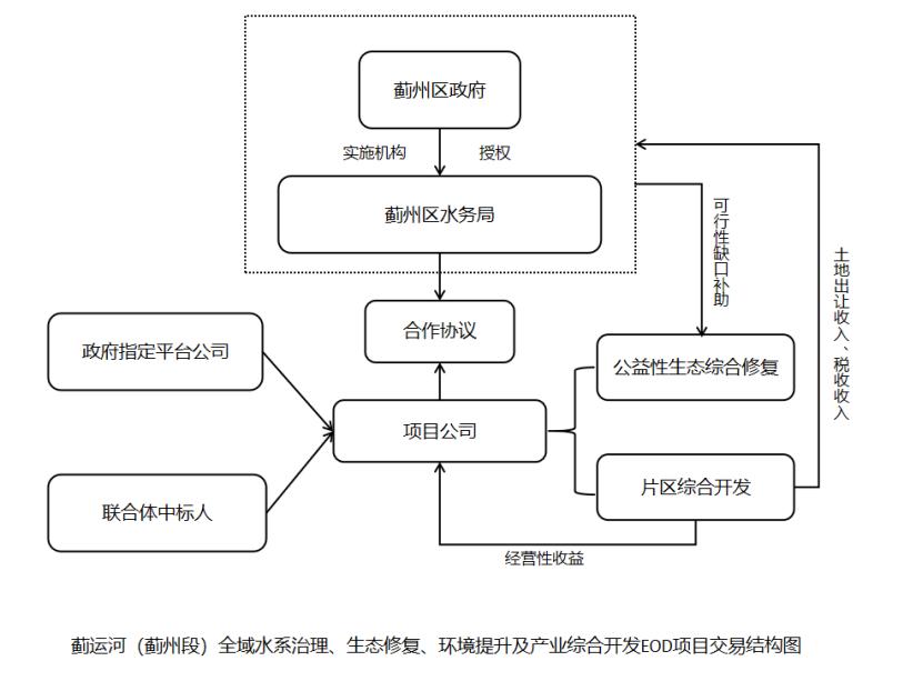10例樣本中,有1例采用PPP模式,即:薊運河(薊州段)全域水系治理、生態(tài)修復、環(huán)境提升及產(chǎn)業(yè)綜合開發(fā)EOD項目。該項目工期為20年,中標額約為65億元。區(qū)政府采用引入投資建設人的方式確定合法投資建設主體,與政府指定的平臺公司依法成立流域投資公司。項目通過生態(tài)綜合修復和片區(qū)綜合開發(fā)兩步實施。公益性生態(tài)綜合修復部分包括水系綜合治理、礦山修復。而片區(qū)綜合開發(fā)部分主要指生態(tài)環(huán)境修復后,規(guī)劃一定比例的土地空間進行產(chǎn)業(yè)開發(fā),中交集團利用自身運營能力,引入觀光農(nóng)業(yè)、康養(yǎng)、新能源等環(huán)境友好型項目,實現(xiàn)環(huán)境+社會+經(jīng)濟效益的結(jié)合。收益構成方面,一方面是政府付費部分,即針對流域治理部分政府購買服務,中交聯(lián)合體提供建設運營養(yǎng)護服務并結(jié)合績效獲得政府付費;二是使用者付費部分,即結(jié)合薊州區(qū)自然資源及中交聯(lián)合體企業(yè)資源,導入文化旅游、康養(yǎng)運動、智慧農(nóng)業(yè)等項目,盤活經(jīng)營性資產(chǎn),中交聯(lián)合體獲得相關經(jīng)營性收益;三是政府方提供的額外收益,如中交聯(lián)合體可按比例獲得土地增值收益、綜合治理專項補助資金等。