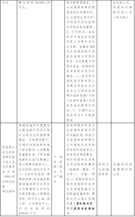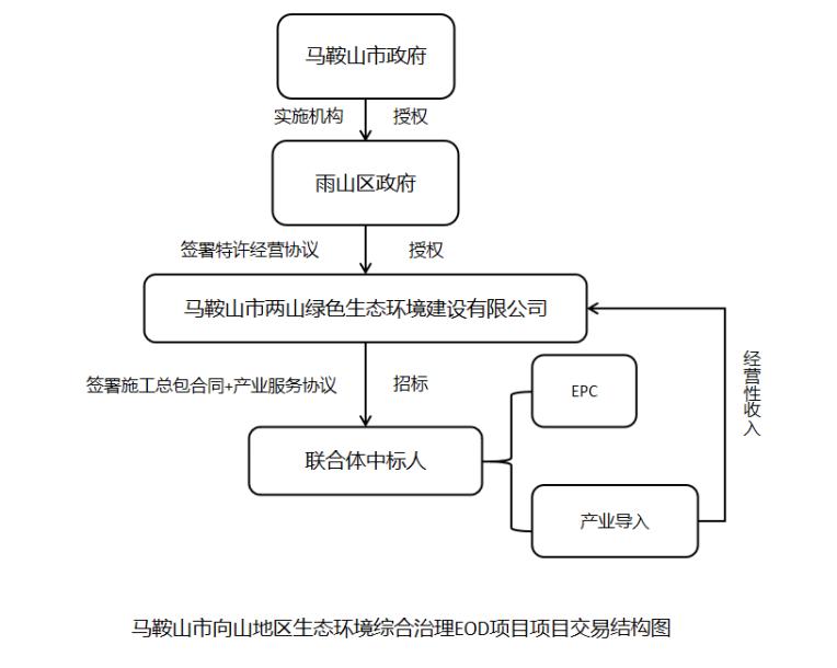 10例樣本中,有2例采用“特許經(jīng)營+EPC”模式,即:馬鞍山市向山地區(qū)生態(tài)環(huán)境綜合治理EOD項目(EPC+產(chǎn)業(yè)導入)、和縣憨山生態(tài)科技創(chuàng)新發(fā)展示范區(qū)生態(tài)環(huán)境導向開發(fā)(EOD)項目。以馬鞍山項目為例,項目總投資約82.65億元。項目合作期(特許經(jīng)營期)為30年,其中整體建設期為3年,整體運營期為27年。馬鞍山市人民政府授權馬鞍山市雨山區(qū)人民政府為本項目實施機構。該項目采取兩階段招標方式操作,項目第一階段由雨山區(qū)人民政府通過競爭性程序選擇本項目的特許經(jīng)營者。雨山區(qū)人民政府和中標特許經(jīng)營者簽署特許經(jīng)營協(xié)議,由特許經(jīng)營者負責本項目的整體投資、建設、運營、產(chǎn)業(yè)發(fā)展、移交等各項工作,并享有相應的收益權,通過項目經(jīng)營性收入方式獲得投資回報。雨山區(qū)人民政府作為實施機構,負責牽頭對特許經(jīng)營者進行監(jiān)督和考核。合作期滿后,特許經(jīng)營者將本項目設施及其權益無償移交給市政府指定機構。項目第二階段由特許經(jīng)營者作為招標人以EPC+產(chǎn)業(yè)導入方式確定項目的總承包單位。其中本項目范圍內(nèi)產(chǎn)業(yè)導入標準、內(nèi)容、考核機制等,另行簽訂產(chǎn)業(yè)服務協(xié)議。未來項目產(chǎn)生碳匯交易、固廢填埋收入(占項目總收入比例約為76%)、種植經(jīng)濟林、停車場運營、文旅項目開發(fā)與運營等經(jīng)營性收入。