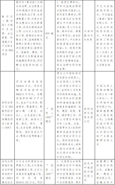樣本顯示,EOD項目主要采取“投資人+EPC”、PPP、“特許經(jīng)營+EPC”以及施工總承包等模式實施。其中施工總承包項目3個;PPP項目1個;“投資人+EPC”項目4個;“特許經(jīng)營+EPC”項目2個。