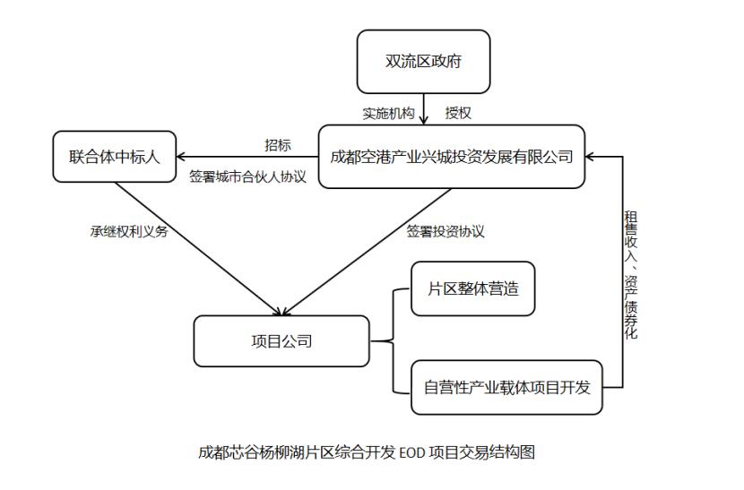 “投資人+EPC”模式又稱“股權合作型EPC”模式,一般被認為是EPC+F模式的衍生變種,主要是指項目承接主體(通常為EPC總承包方)與項目業(yè)主共同成立項目公司,項目公司在承接主體協(xié)助下籌措項目建設資金,取得EPC工程,進行項目運營管理,并獲得投資收益。10例樣本中有4例均采用“投資人+EPC”模式,占比接近半數(shù)。以成都芯谷楊柳湖片區(qū)綜合開發(fā)EOD項目為例,該項目位于成都雙流西側(cè)楊柳湖片區(qū)。建設內(nèi)容包含兩部分,一是片區(qū)整體營造項目,靜態(tài)總投資約為209.15億元,包括片區(qū)內(nèi)生態(tài)環(huán)境提升、基礎設施及公服設施建設、運維、產(chǎn)業(yè)導入等;二是自營性產(chǎn)業(yè)載體項目開發(fā),靜態(tài)建設總投資約為49.84億元,2022-2024年,空港興城產(chǎn)投公司預計在片區(qū)內(nèi)進行工業(yè)用地、科研用地的開發(fā),包括標準化廠房、科研樓、產(chǎn)業(yè)配套設施建設、運營等。在通過公開方式選定城市合伙人后,空港興城產(chǎn)投公司與城市合伙人按約定在雙流區(qū)實際管轄范圍內(nèi)組建合資公司,由合資公司負責具體組織實施本項目。合資公司注冊資本金暫定10億元,股東各方以貨幣出資,城市合伙人持股80%,空港興城產(chǎn)投公司持股20%,由股東各方按照各自認繳的出資比例繳納到位。項目中自營性產(chǎn)業(yè)載體項目合作期原則上不超過25年。