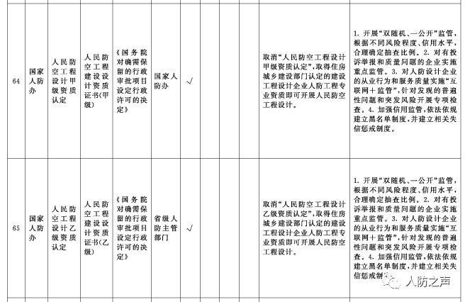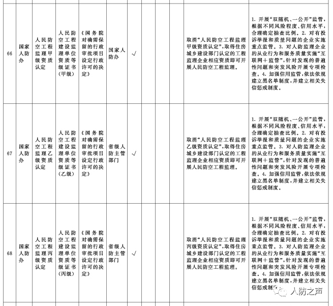 2、取消“人民防空工程監(jiān)理甲、乙、丙級資質(zhì)認(rèn)定”,取得住房城鄉(xiāng)建設(shè)部門認(rèn)定的工程監(jiān)理企業(yè)相應(yīng)資質(zhì)即可開展人民防空工程監(jiān)理。