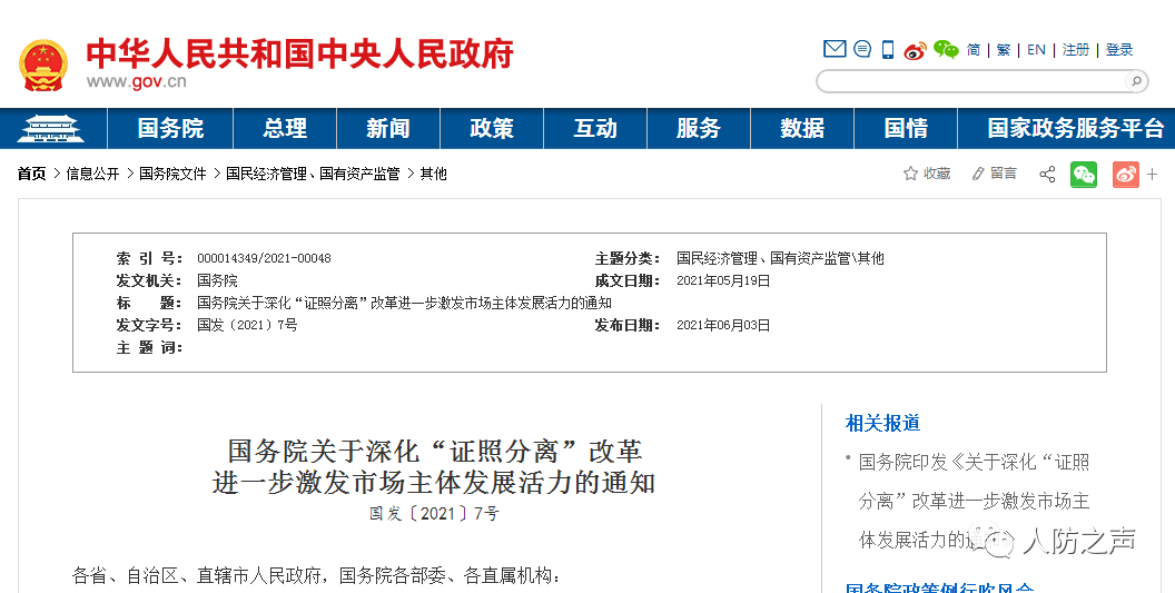 據(jù)中國政府網(wǎng)6月3日消息,國務(wù)院發(fā)布關(guān)于深化“證照分離”改革進(jìn)一步激發(fā)市場主體發(fā)展活力的通知。通知提出,自2021年7月1日起,在全國范圍內(nèi)實施涉企經(jīng)營許可事項全覆蓋清單管理,按照直接取消審批、審批改為備案、實行告知承諾、優(yōu)化審批服務(wù)等四種方式分類推進(jìn)審批制度改革,同時在自由貿(mào)易試驗區(qū)進(jìn)一步加大改革試點力度,力爭2022年底前建立簡約高效、公正透明、寬進(jìn)嚴(yán)管的行業(yè)準(zhǔn)營規(guī)則,大幅提高市場主體辦事的便利度和可預(yù)期性。