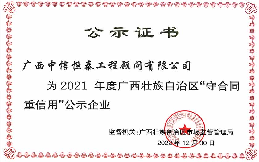 近日,廣西壯族自治區(qū)市場(chǎng)監(jiān)督管理局發(fā)布了《關(guān)于公示廣西2021年度“守合同 重信用”企業(yè)名單的通告》。中信恒泰憑借規(guī)范的合同管理、誠(chéng)信的經(jīng)營(yíng)理念和良好的市場(chǎng)信譽(yù),再度榮獲2021年度廣西“守合同重信用”企業(yè)稱號(hào)。