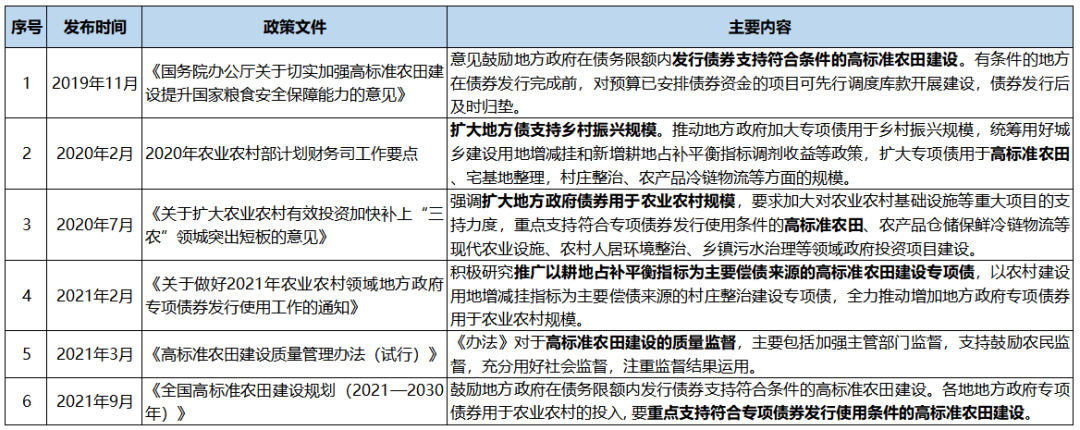 自2014年《高標(biāo)準(zhǔn)農(nóng)田建設(shè)通則》頒布以來,現(xiàn)代農(nóng)業(yè)建設(shè)加速發(fā)展,高標(biāo)準(zhǔn)農(nóng)田建設(shè)內(nèi)容、建設(shè)標(biāo)準(zhǔn)和技術(shù)要求難以適應(yīng)現(xiàn)代農(nóng)業(yè)發(fā)展、綠色生態(tài)要求和實施鄉(xiāng)村振興戰(zhàn)略需要。由此,國務(wù)院、農(nóng)業(yè)農(nóng)村部相繼出臺政策文件,全力保障高標(biāo)準(zhǔn)農(nóng)田的建設(shè)規(guī)劃。國家在出臺高標(biāo)準(zhǔn)農(nóng)田的政策文件時,強(qiáng)調(diào)要充分利用好專項債券來支持高標(biāo)準(zhǔn)農(nóng)田的建設(shè)工作。具體如下文件所示: