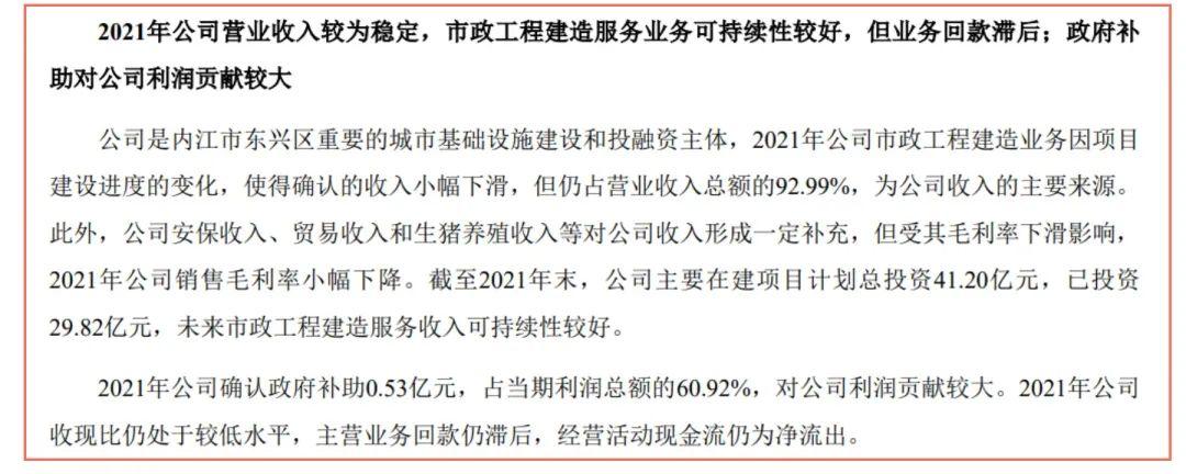 上圖為某公司在中國貨幣網(wǎng)披露的債券跟蹤評級報告,報告中除財務(wù)會計報告外,還披露了市政工程建造服務(wù)業(yè)務(wù)回款滯后,政府補助對公司利潤貢獻較大的情況,實際上,即便合同中并未約定“背對背條款”,但基礎(chǔ)設(shè)施項目回款與業(yè)主業(yè)務(wù)回款和國家投資落實情況仍息息相關(guān),業(yè)主回款滯后往往導(dǎo)致承包人亦回款困難,可能造成一定的墊資壓力。