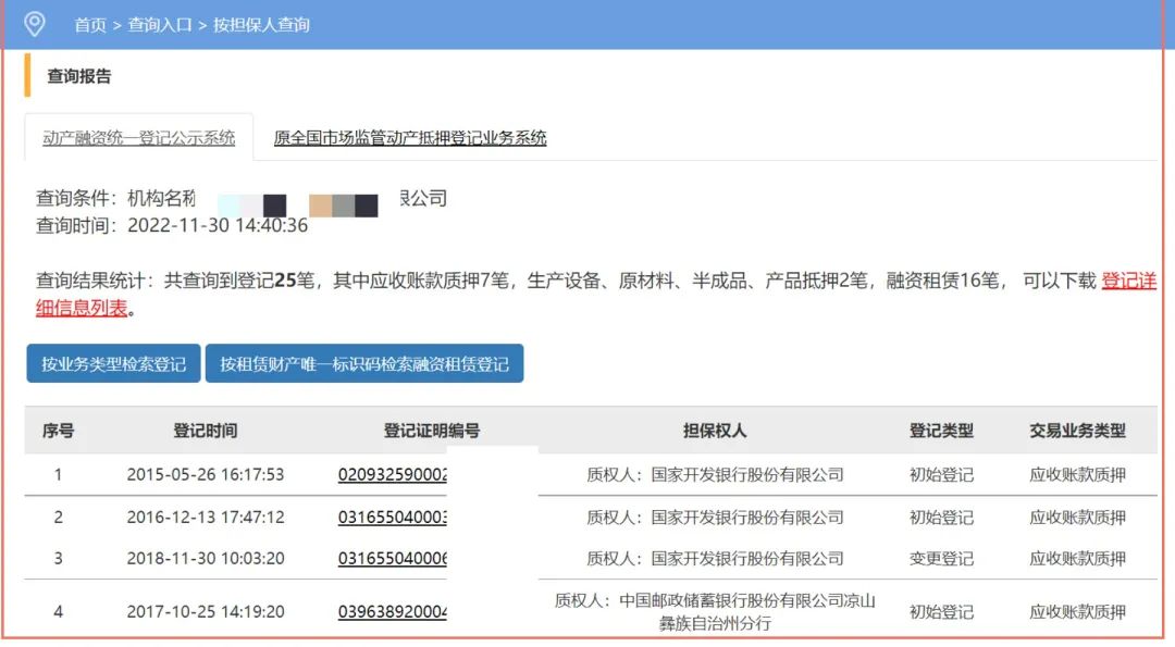 自2021年起,《國務(wù)院關(guān)于實施動產(chǎn)和權(quán)利擔(dān)保統(tǒng)一登記的決定》第二條中納入統(tǒng)一登記范圍的動產(chǎn)和權(quán)利擔(dān)保,均在征信中心動產(chǎn)融資統(tǒng)一登記公示系統(tǒng)辦理。通過系統(tǒng)可以查詢(擬)交易對象目前的動產(chǎn)和權(quán)利擔(dān)保融資情況,但應(yīng)當(dāng)特別注意的是,該登記由當(dāng)事人自主辦理,登記機構(gòu)不進行實質(zhì)審查。