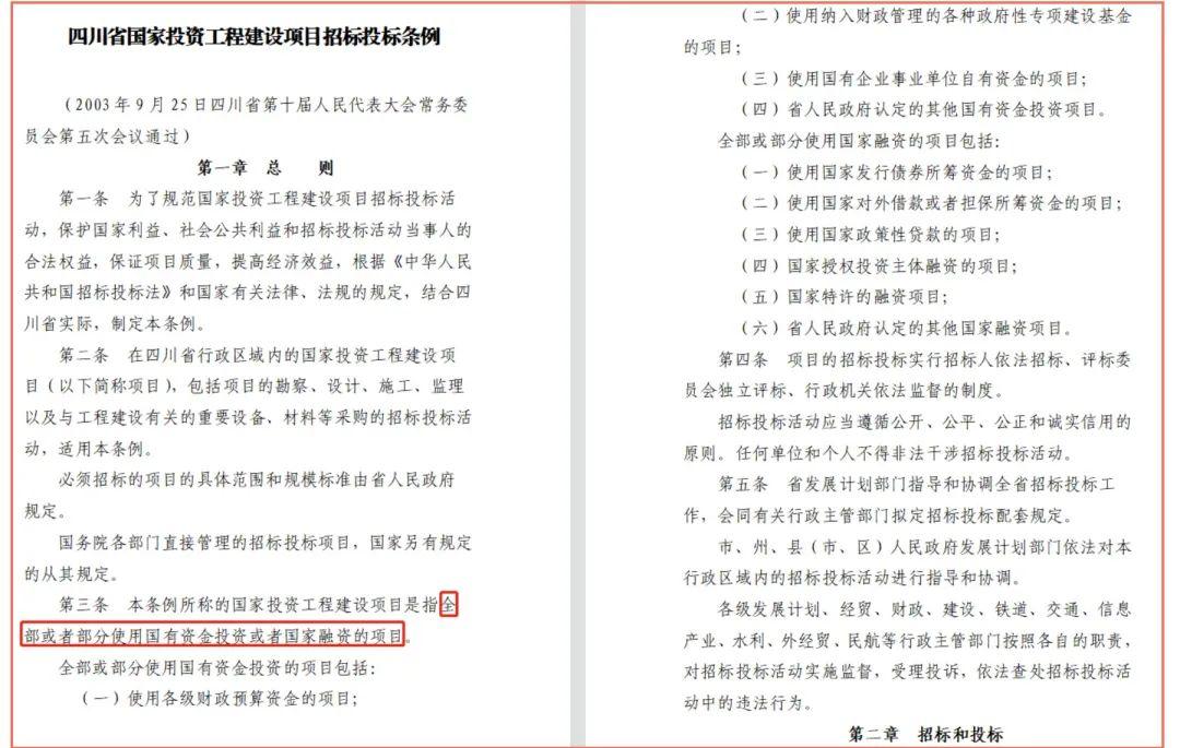 2003年9月25日發(fā)布的《四川省國家投資工程建設(shè)項目招標(biāo)投標(biāo)條例》第三條對“國家投資”的定義和形式進行了詳細規(guī)定:國家投資工程建設(shè)項目是指全部或者部分使用國有資金投資或者國家融資的項目。