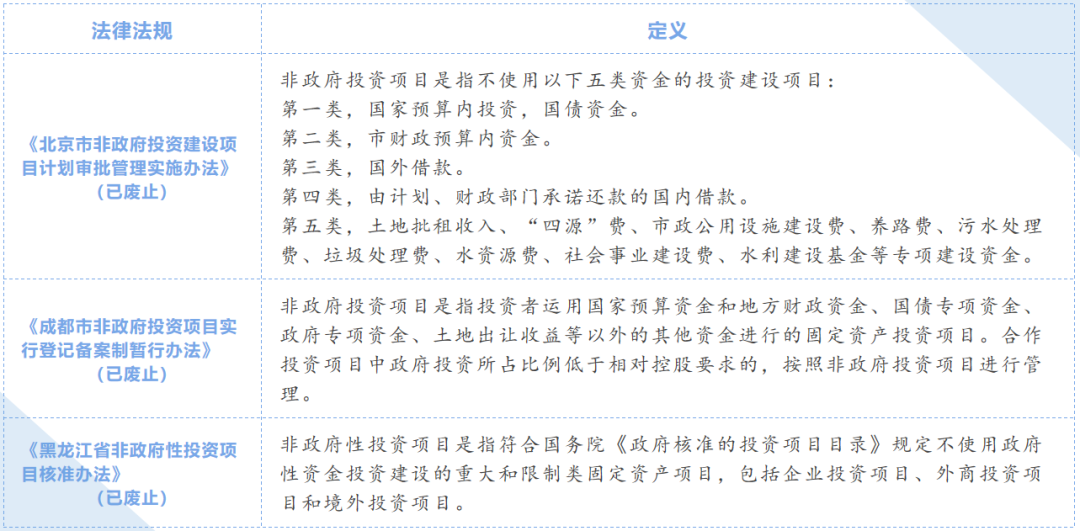 現(xiàn)行有效的法律法規(guī)并未對“非政府投資”作出相關(guān)文義解釋,從已廢止的《北京市非政府投資建設(shè)項目計劃審批管理實施辦法》《成都市非政府投資項目實行登記備案制暫行辦法》《黑龍江省非政府性投資項目核準(zhǔn)辦法》的規(guī)定來看,各地區(qū)對于非政府投資的解釋存在些許出入。