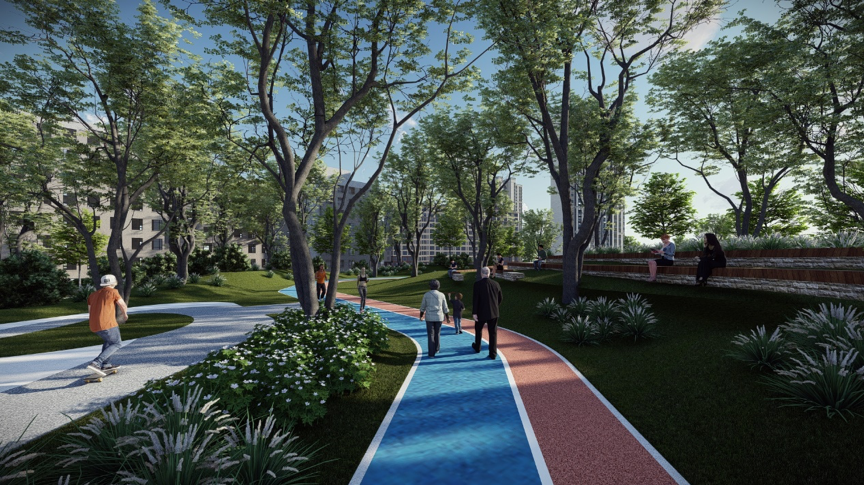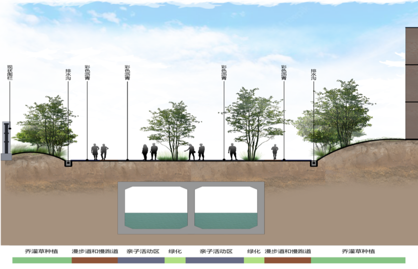 4)打造環(huán)境舒適的帶狀公園。在箱涵兩側(cè)及涵頂覆土,并設(shè)計人行步道和綠化園林,打造成帶狀公園,同時具備景觀觀賞、原生河涌保護、健身運動、活動休閑等功能,重塑市民與城市文脈進行精神交流的空間,舒緩心理壓力,體現(xiàn)人文關(guān)懷。