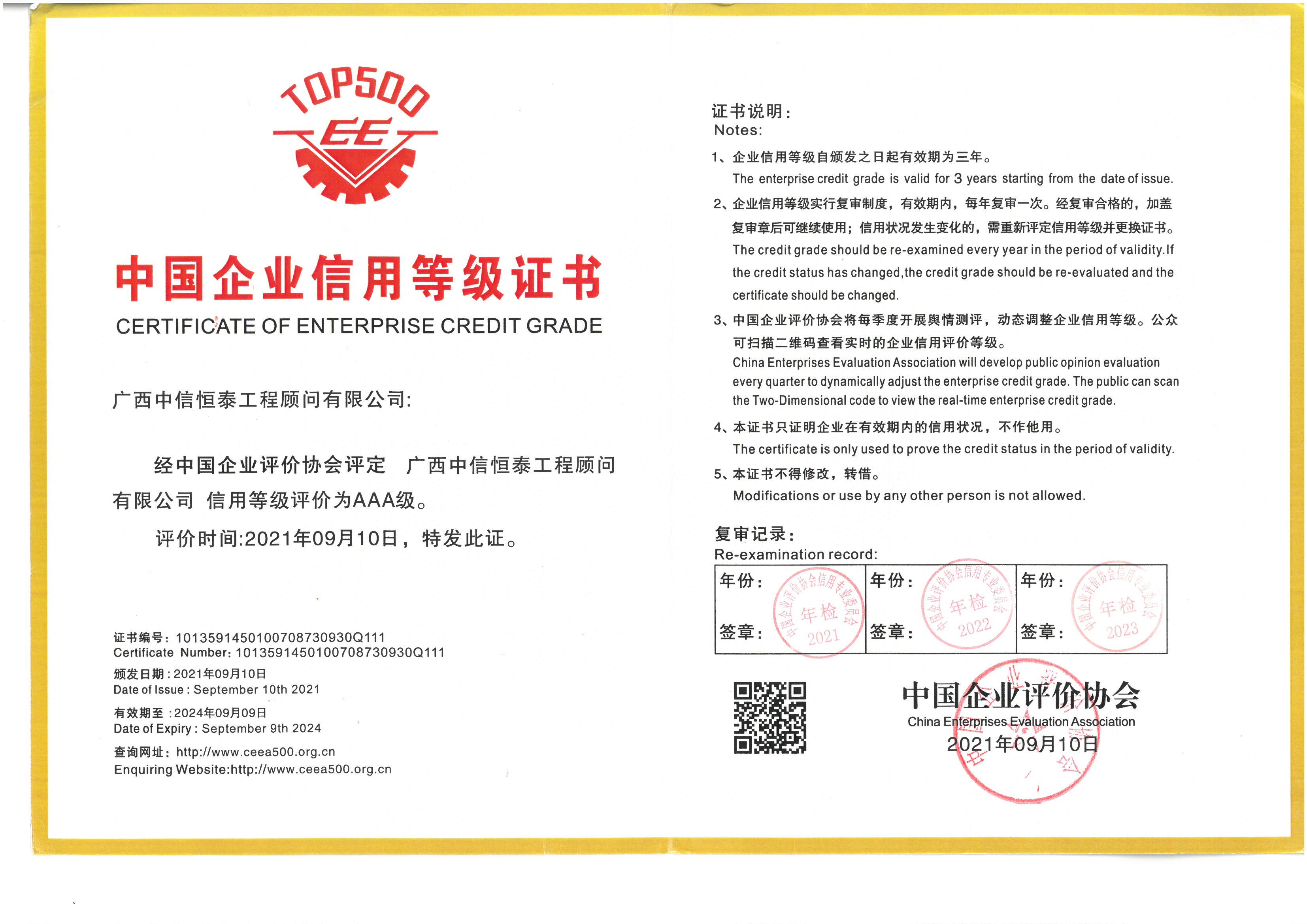 中國企業(yè)信用等級評價AAA級