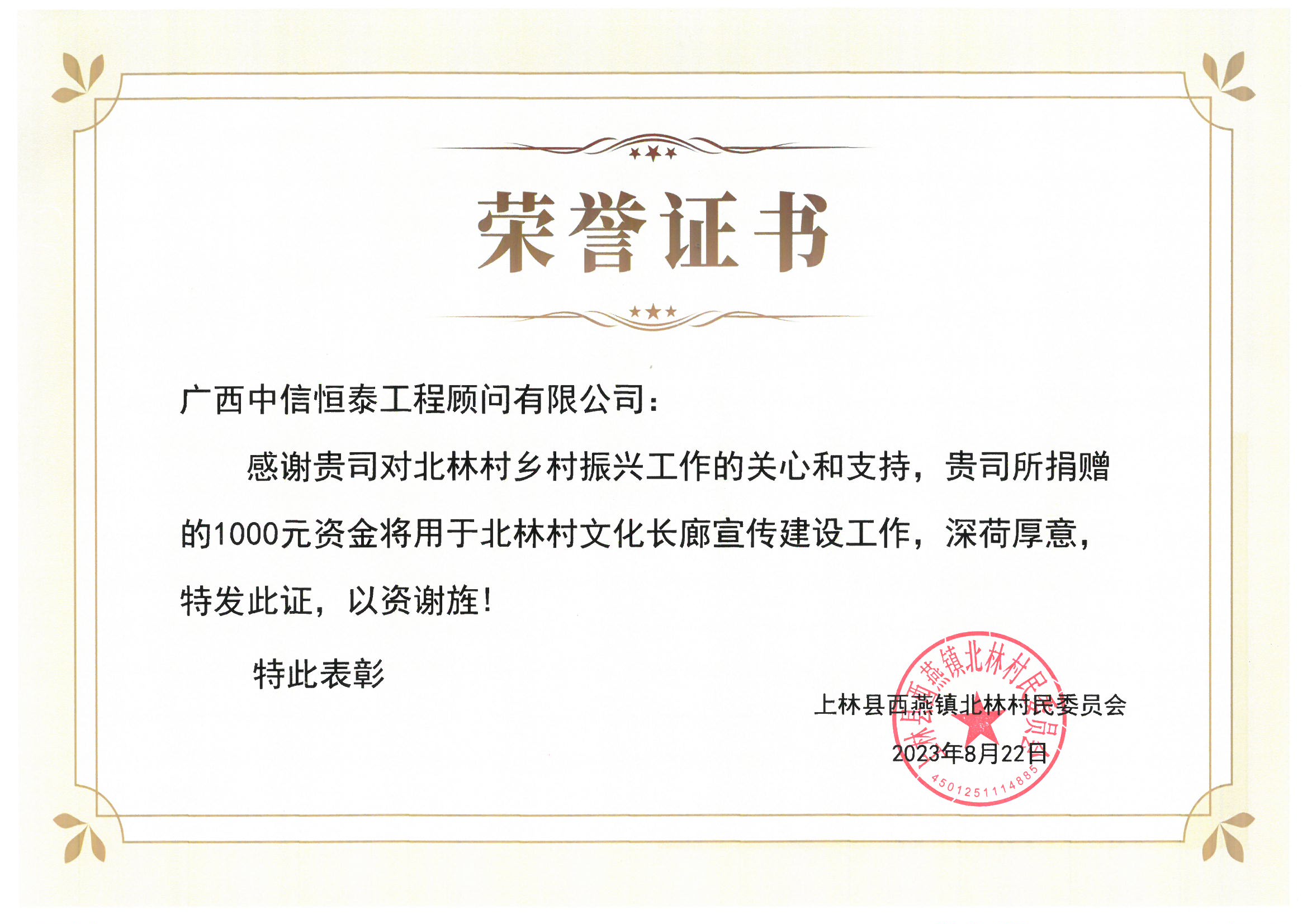 助力鄉(xiāng)村振興“北林村”捐贈-榮譽證書
